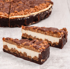 Нежный чизкейк из творожного сыра с начинкой из мягкого кокосового кранча с мякотью кокоса на песочно-шоколадной подложке.